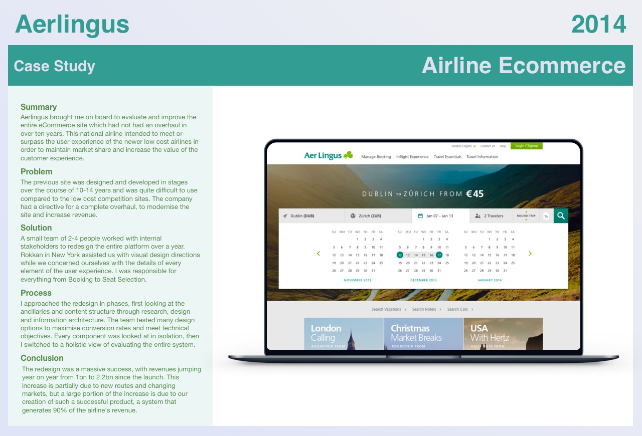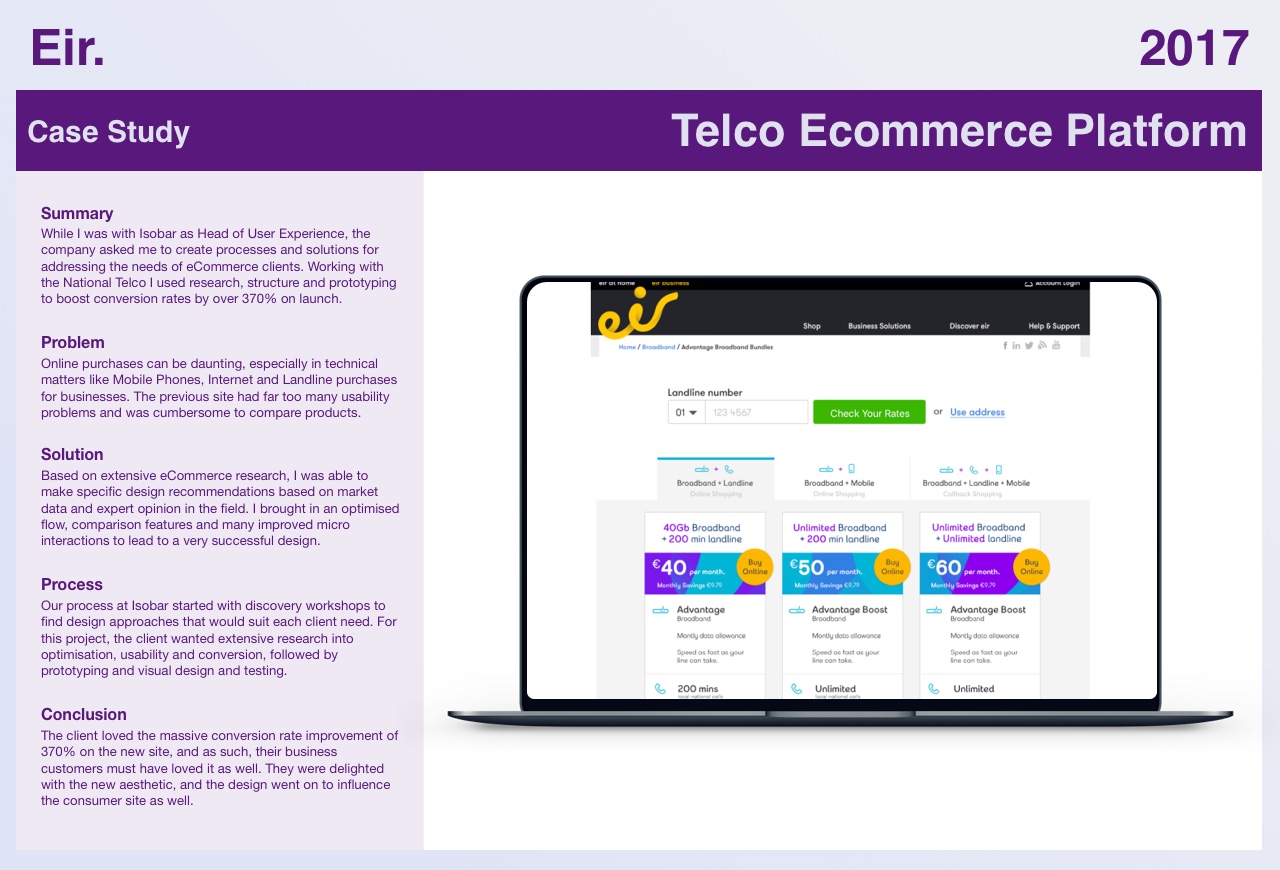 Leading as Head of UX for the Dublin office, I optimised research and design processes for larger eCommerce clients, including a 380% increase in conversion for Eir Business. While there, I acted as Head of UX on solutions for Eir, BMW, Hertz, Tayto, Thomas Cook, UCD, Cartrawler & Coillte.
